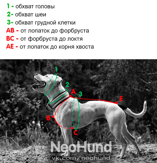 - Мерка АВ измеряется по одной стороне собаки.